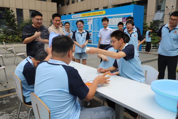 隨著清脆的哨聲,一場別開生面的“蒙眼倒水接力”率先上演。這是一個體現(xiàn)學子們勇敢與身手敏捷的游戲。每當有人成功將水倒入后面的水盆中時,周圍立刻爆發(fā)出陣陣歡呼與掌聲,參與游戲的同學那份成就感與喜悅,在夏日的空氣中久久回蕩,仿佛帶大家回到了純真無邪的童年時光。